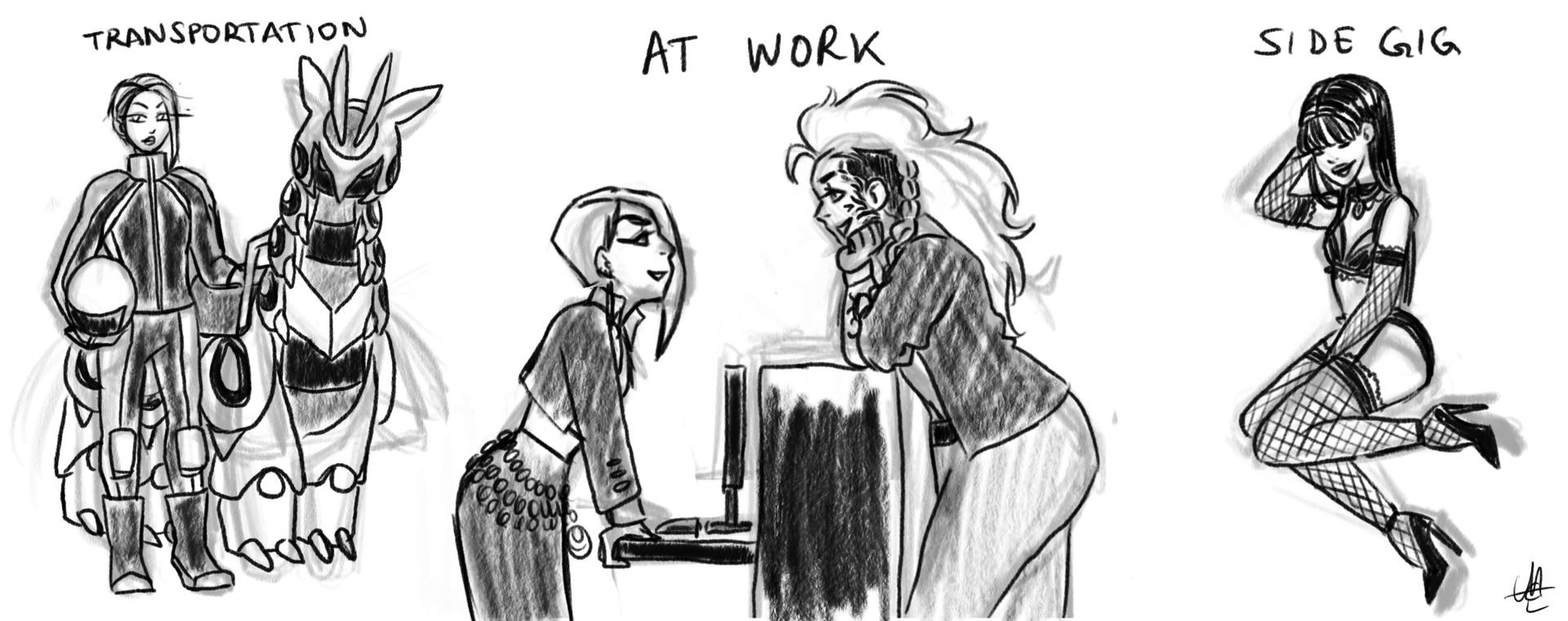 I reread the prompt and realized I might have interpreted it wrong. The idea was to draw what usually happened in a day for Cléophée. I hope it’s ok still. She’s not that loyal to Malae and her job is indeed welcoming people at the front desk. Which is more often than not chatting with Odessa