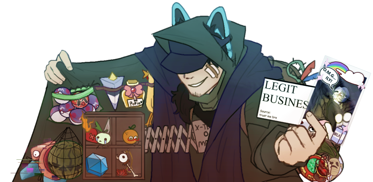 The man opens his coat, revealing… Well, quite frankly… An array of random bullshit? You’re not quite sure what you’re looking at. What even are half of those? Is that a rubber duck? Before you can say anything, he shoves a “LEGIT BUSINESS” card up in your face. You have no choice but to accept it, although in retrospect that probably was your first mistake. “Whaddaya want,” he asks, “Zekrom? Lugia? Arceus? I have them all.” You stare blankly at him for a moment. Is he for real? Well… I mean… if he’s asking… Dialga’s always been your favorite… He reaches for a couple of poké balls. “Who am I kidding. I have no idea which one is in which. Call it a fun surprise! Only 999.99$ a pop. Waddaya say?”