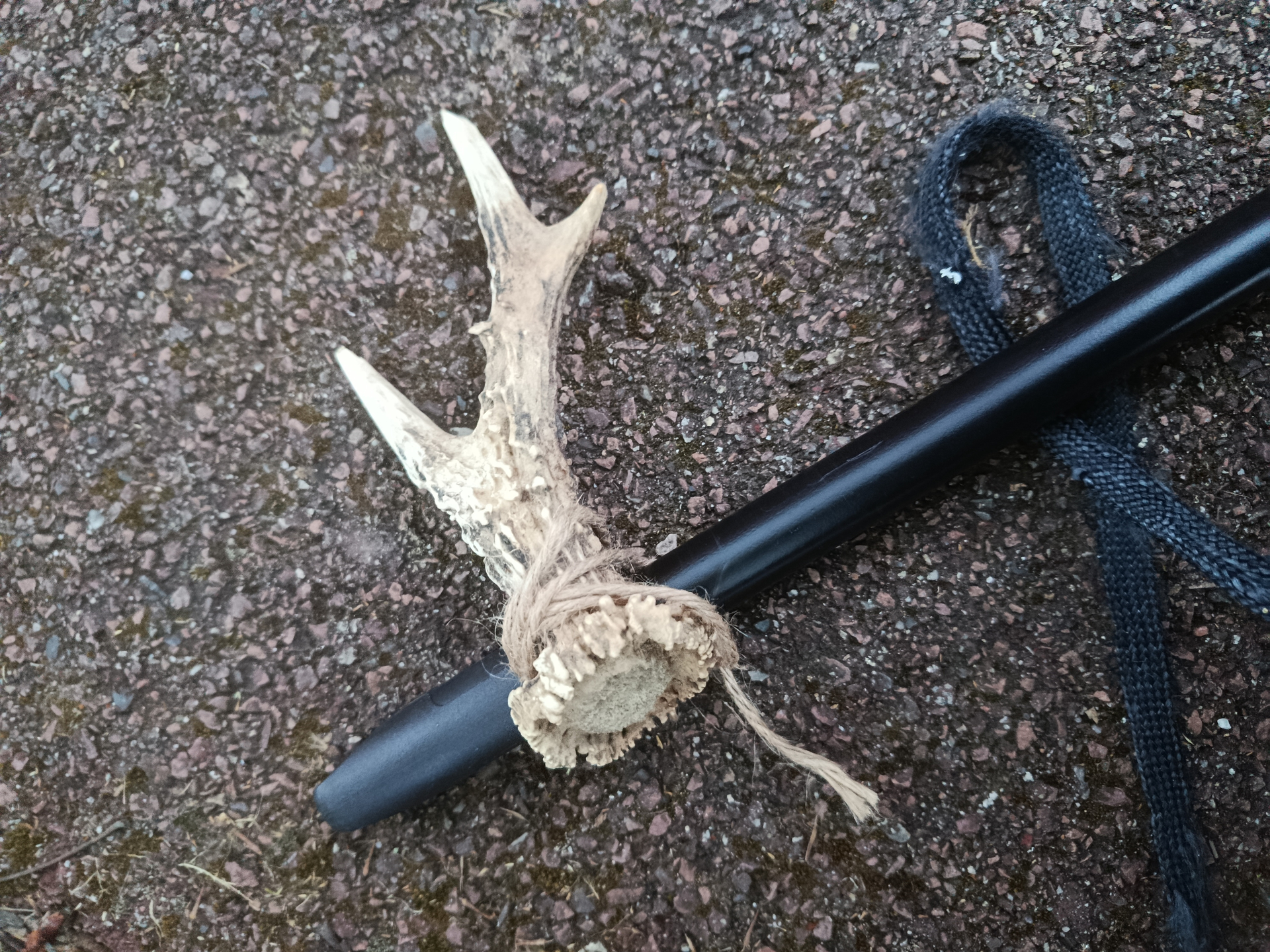 Vivi got his leash stuck in a tree AGAIN and I had to craft a literal ooga booga stick with a broom and a fucking ANTLER to get it back down.